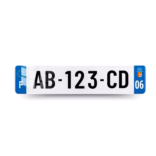 Nos plaques d’immatriculation 06 (Alpes-Maritimes) affichent le logo européen (12 étoiles jaunes) ainsi que le F de France sur l’eurobande gauche et le blason régional officiel PACA et le code postal 06 sur deux chiffres sur l’eurobande droite.