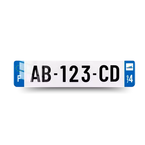 Les plaques d’immatriculation 974 (La Réunion) sont 100% conformes et affichent le logo européen (12 étoiles jaunes) ainsi que le F de France sur l’eurobande gauche et le blason régional officiel de La Réunion et le code postal 97 sur deux chiffres sur l’eurobande droite.