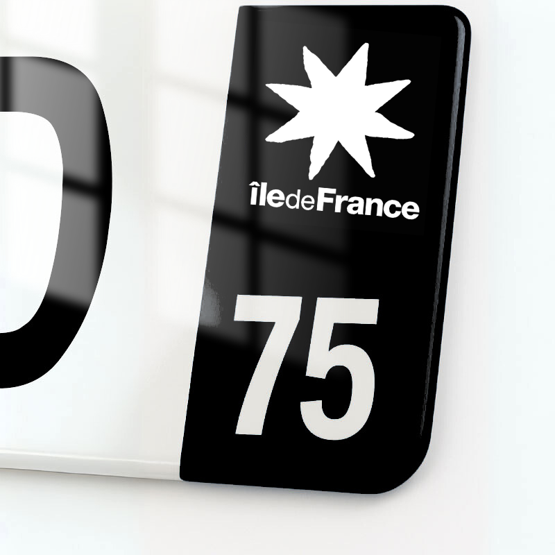 – Une eurobande bleue (droite) qui affiche l’identifiant territorial : les deux chiffres du code postal accompagné du blason régional officiel.